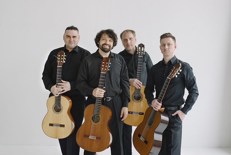Квартет гитар – оригинальный ансамбль, удивляющий публику не только своим мастерством и постоянно обновляющимся репертуаром. Каждому музыканту присущи яркая индивидуальность, смелость прочтения, помноженные на бесспорное артистическое обаяние. Евгений Финкельштейн – ученик знаменитых Александра и Камилла Фраучи, чьи традиции он блестяще продолжает в исполнительском творчестве и педагогике. Алексей Корбанов, Алексей Соколов и Дмитрий Притула – ученики Евгения Финкельштейна, известные исполнители, ставшие лауреатами многих международных конкурсов. Музыканты сыграли целый ряд премьер произведений, написанных Геннадием Беляевым и Юлией Финкельштейн специально для квартета гитар. Находясь в постоянном творческом поиске, они представляют на суд зрителей интересные квартетные версии произведений Валерия Гаврилина, Никиты Кошкина, Сергея Руднева и других авторов.